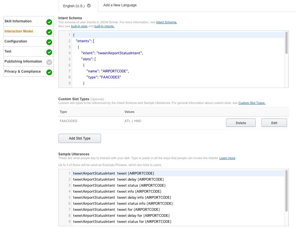 あとは通常通りUtterance, Slot, Intent Schemaを埋めていきます。これも上記のサンプルコードの[/Skill/Resource]の中に入っているのでマルっとコピペしてもらえれば動きます。