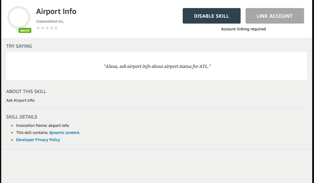 これでAccount Linkは成功です。テストしてみます。ハーツフィールド・ジャクソン・アトランタ国際空港(空港コードATL)の様子をツイートして、と頼むとAlexaを通してツイートされ、返事が返ってきます。