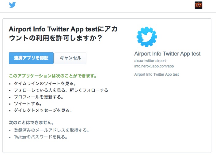 Twitter APIからの認可が下りたらSkillとリンクされたことが表示されます。