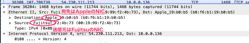 自分で探すこともできますが、Wiresharkを使うと勝手にベンダー名を表示してくれます。