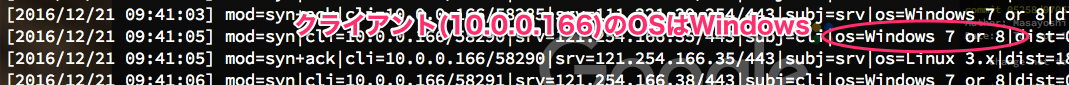 これによってp0f.logに結果が出力され、以下のように表示されます。