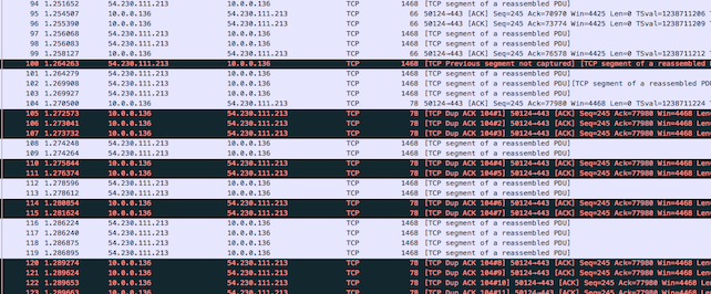 上記の図では複数回黒い行が発生していますが、これはサーバから送信されたパケットが1つ欠損したのに対し、速く欠けたパケットを送れとクライアントが急かしているために送っているACKパケットも黒く表示されているだけで、パケットロス率が多くなっているわけではありません。