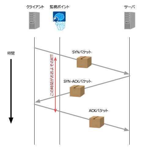 そこでネットワークキャプチャだけでこれを調べる方法としてTCPの3-way-handshakeを利用する方法が考えられます。TCPは通信の開始時にSYNパケット、SYN-ACKパケット、ACKパケットをクライアント、サーバ間で相互に投げ合い、通信を確立します。ここでの処理は通常OSのカーネル空間のみで処理が完結し、さらにネットワーク以外のI/Oが発生することもあまりないため、パケットを受けてから返すまでの処理は比較的低遅延で実施されます。これを利用して「SYNパケットが観測されてからACKパケットが観測されるまでの時間」を見ることでおおよそのクライアント・サーバ間のRTTを知ることができます。図にすると以下のような感じです。