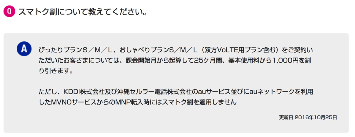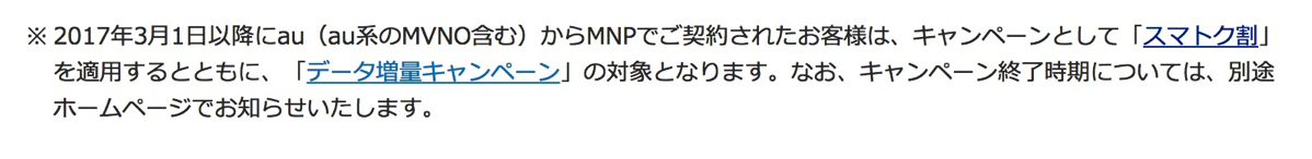 2017年3月1日以降は、auおよびそのMVNOからの転入でもスマトク割の割引対象となるうえ、データ増量キャンペーンによってデータ通信量が通常の2倍適用されるように方針が変更となっている。ただし、現時点ではキャンペーン扱いとなっている。