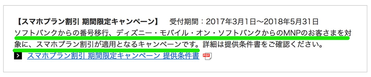 ソフトバンクのサブブランドであるワイモバイルでもUQ mobileと同様にSoftBankからの番号移行やディズニー・モバイル・オン・ソフトバンクからのMNP転入については各種キャンペーンの適用外としていたものの、2017年3月1日より方針を転換し、これらの契約であっても各種キャンペーンの適用対象としている。スマホプラン割引にて「2017年3月1日よりソフトバンク系からのMNPも対象に」。公式Webページ「スマートフォンご契約者さま向け割引(スマホプラン割引)|割引サービス|料金|Y!mobile(ワイモバイル)より
