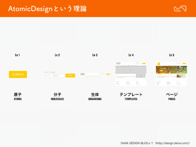 (榊原補足:厳密には、Atomic Designは粒度毎のコミュニケーションとワークフローデザイン論ですので、「コンポーネント指向の理論」という見方は一側面となります)