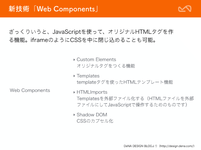 Web Componentsは、Custom Elements、Templates、HTML Imports、Shadow DOMと言った要素技術から成り立っています。