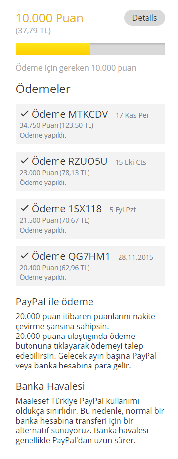 10.000 puanlık bir anketin ödülü 10 Euro’dur. (23 TL) Ödeme alabilmek için en az 20.000 puan kazanmış olmanız gerekir. 20.000 Puan = 20 Euro = 50 TL civarı.