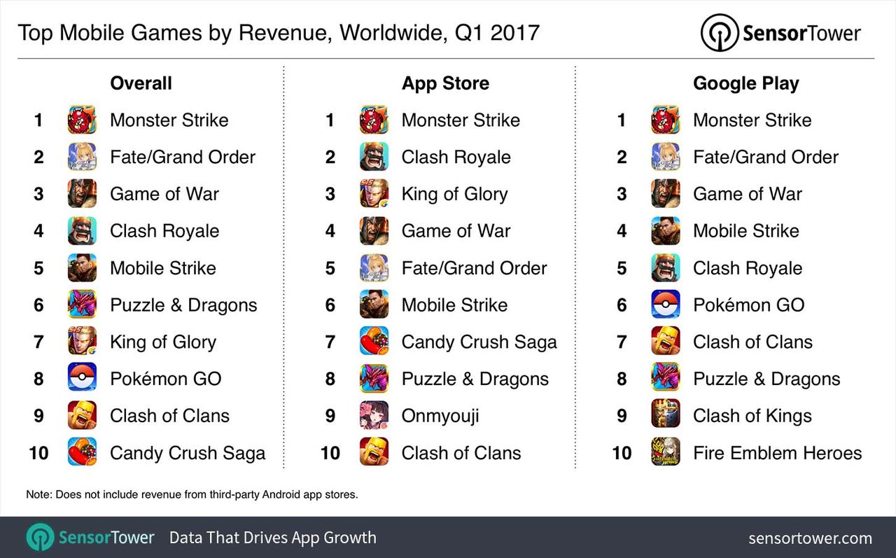 2017年Q1期における世界で最もインストールされたゲームはKilooのSubway Surfers。最も収益を上げたのはmixiのモンスターストライクだった。2016年Q4期にはランクインしていなかったにも関わらず今回両方のランキングで10位以内にランクインした注目作にはTencentのKing of Gloryが挙げられている。