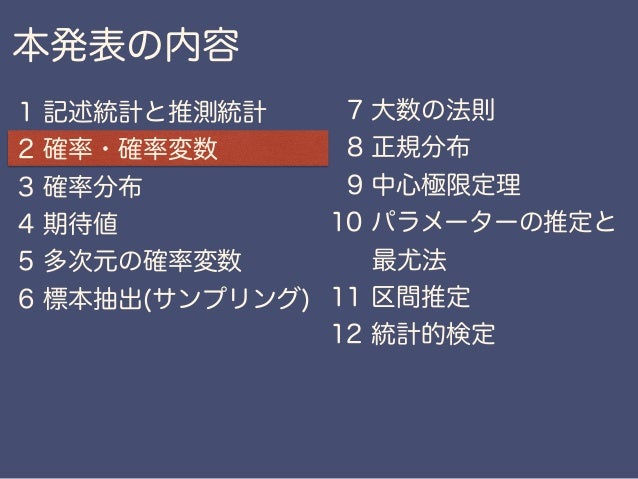 本講演では、主に確率、統計の初心者の方や、プログラマ、エンジニアの方でデータ分析に興味を持っている方が確率統計のエッセンスを数理的に理解できることを目標に、データの集約方法から、大数の法則や中心極限定理など、確率・統計で利用される非常に重要な数学の定理などを紹介します。