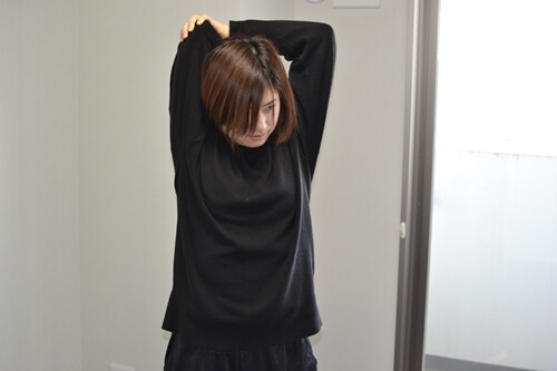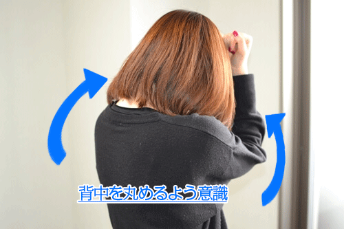 このストレッチによって、肩甲骨の動きがよくなり、手が後ろで組みやすくなります。
