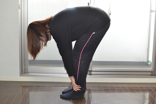 上体を前に倒す時に、背中を丸めてしまうと効果が薄くなってしまうので注意してください。