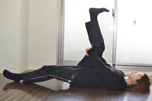 3.膝裏を抱えたまま、ひざを伸ばします。
