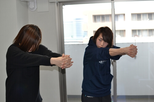 2.組んだ両手を前へ突き出します。この時、肩甲骨を左右に離すイメージで伸ばしてください。