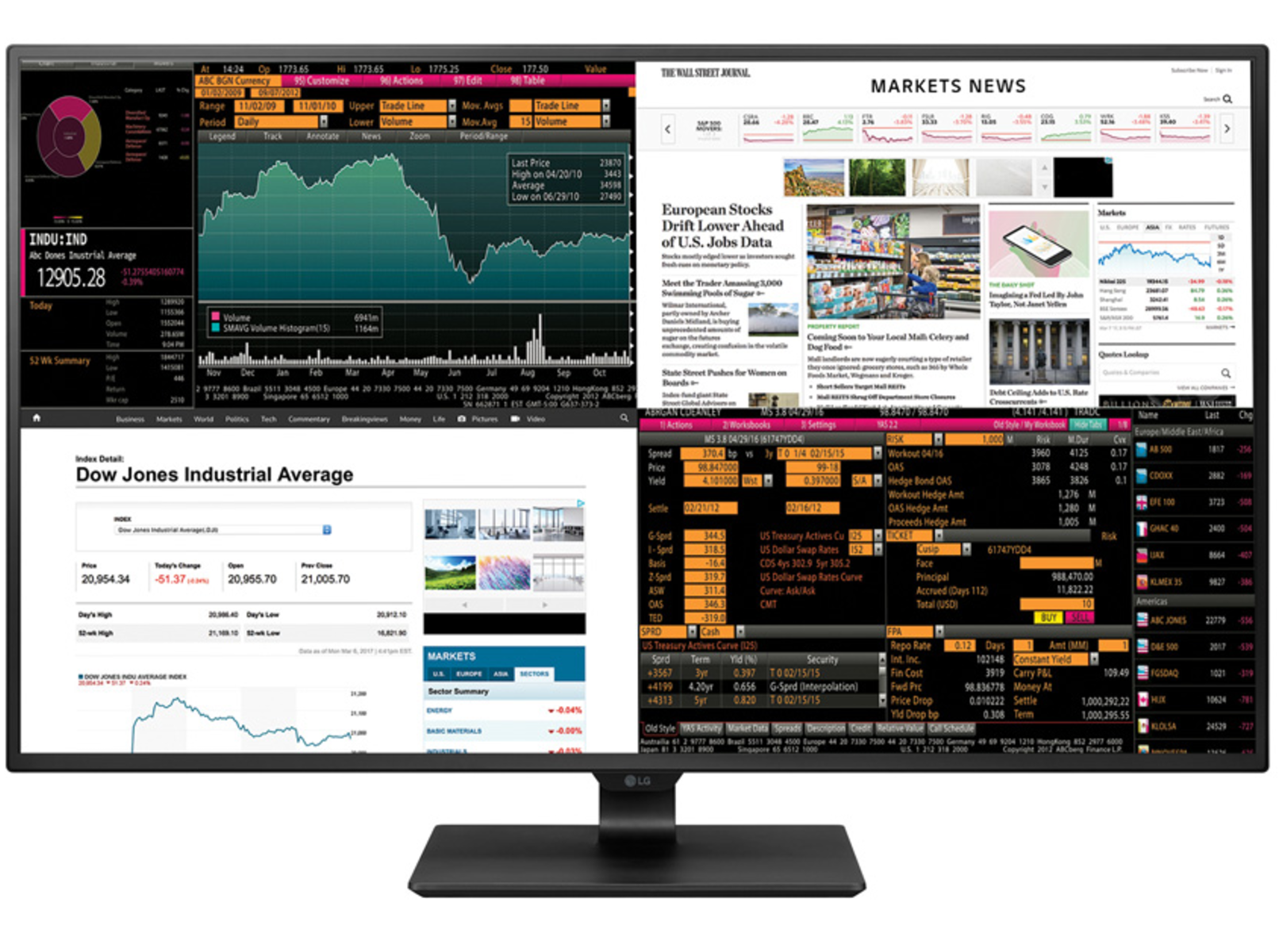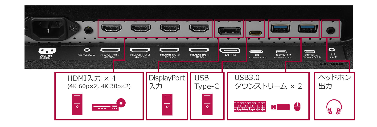 DisplayPortに加え、4系統のHDMI(60Hz対応×2、30Hz対応×2)を装備し、フルHD機器を4台接続し、21型相当の4画面同時表示が可能。