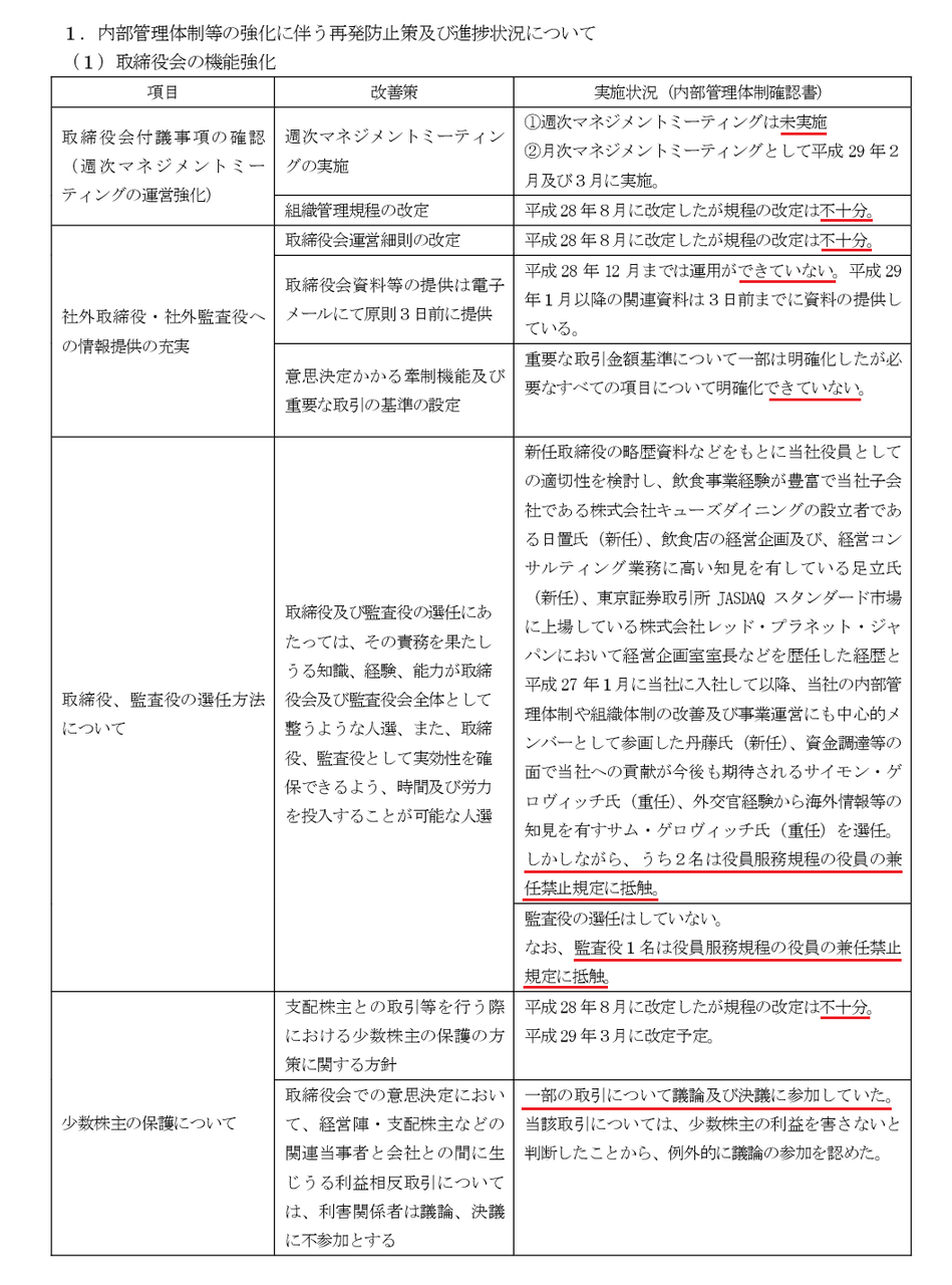 レッド・プラネット・ジャパン(3350)が利用しようとして買収したけど、その前に粉飾をやっていて、買収直後にそれが発覚してからは、フードを色々と利用していて、万策尽きたと言うよりも、今回赤線引かれているところのように上場廃止にしたければすれば、というスタンスだったと感じました。