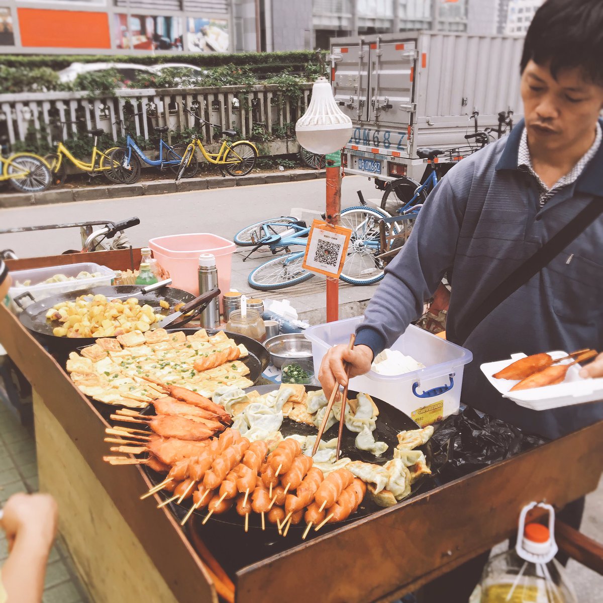 中国はこんな屋台でさえ電子マネーが使える。QRコードだから機種に依存しないしSuicaより便利だよ。LINEペイ……笑笑 pic.twitter.com/B0ohlmQl7W