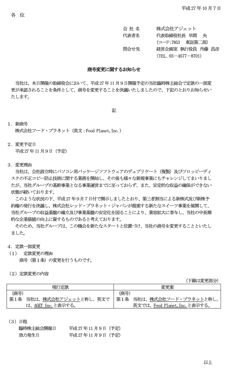 2015/10/07 18:00 アジェット 商号変更に関するお知らせ