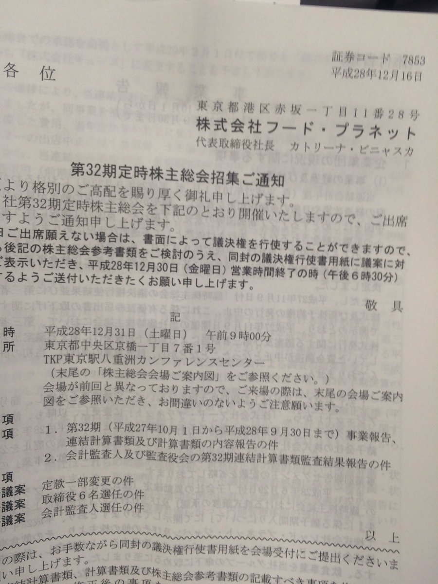 2016/12/05 21:00 フード・プラネット 代表取締役の異動に関するお知らせ