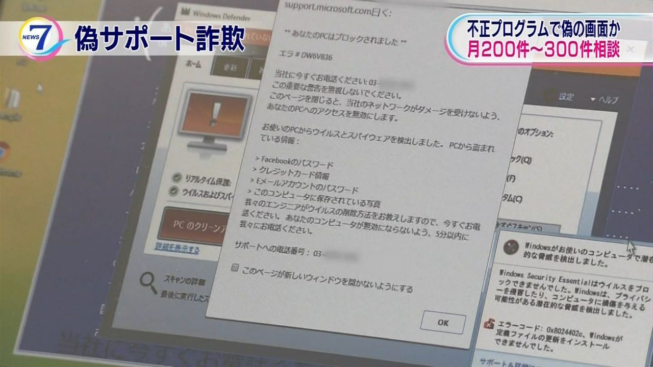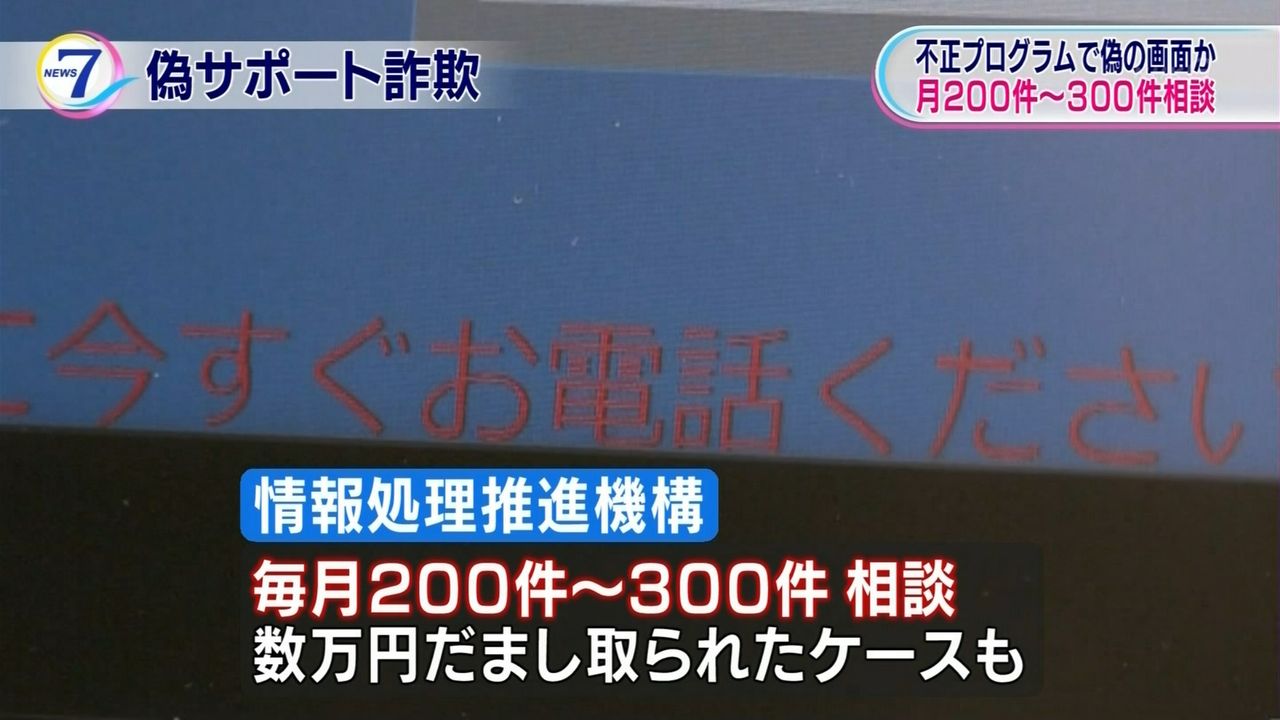こうした手口は「偽サポート詐欺」と呼ばれ、情報処理推進機構には毎月200件から300件の相談が寄せられていて、中には数万円をだまし取られたケースもあるということです。