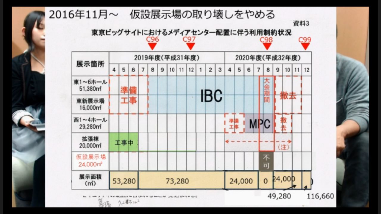 「これが26日の(説明会の)前のやつなんですけれども、まあ、2020年の4月から2万4千平米ぐらいしか使えない。今が10万平米ぐらいなんで、4分の1ぐらいの規模になっちゃうということで。これで見ると、コミケ96、97、98、3回分が影響出ちゃうと。コミケ98はもうほとんどできないと。これがどうにかなるんじゃないかということで、26日に期待をしてですね、(説明会に)行って話を聞いたらですね、出ます?」