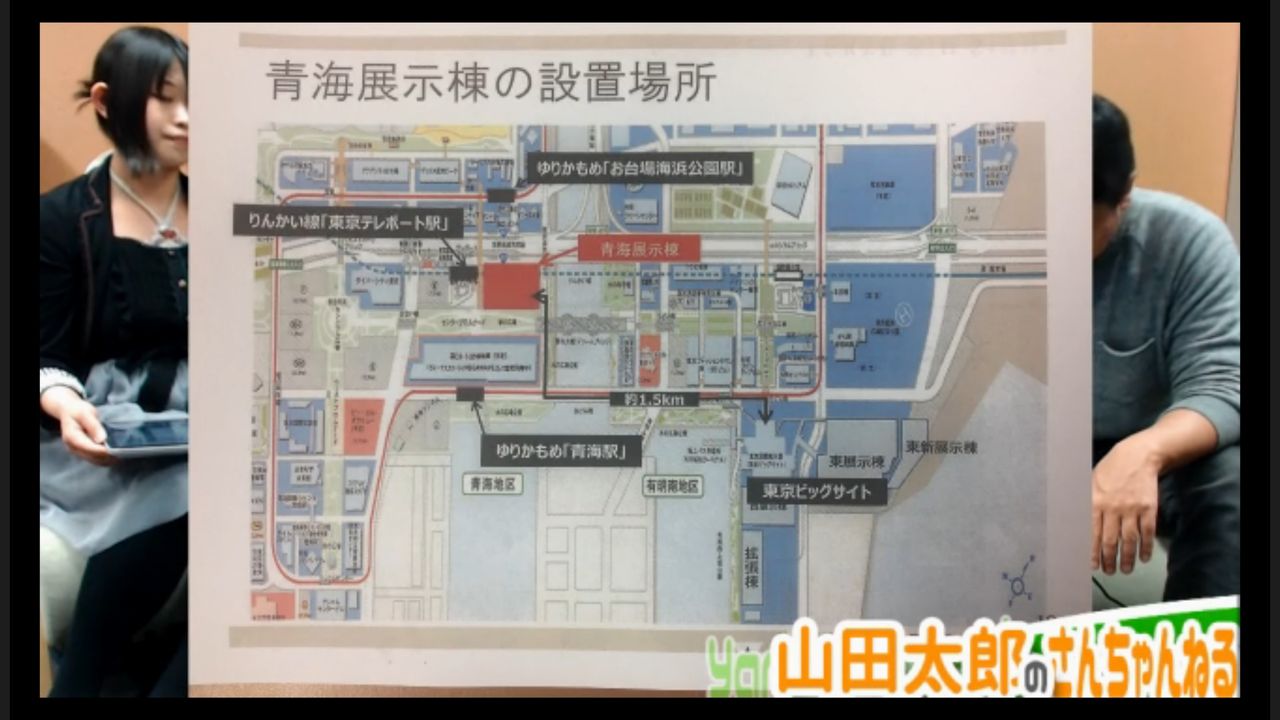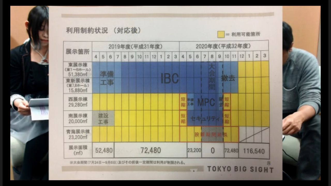「今日のメインテーマであるですね、オリンピックと東京ビッグサイト問題に入りたいと思います。これ、前回の放送でもやったと思うんですが、オリンピックによってですね、東京ビッグサイトが、ある期間使えなくなる、または、(そこで開催するイベントの規模を)縮小せざるを得なくなる。