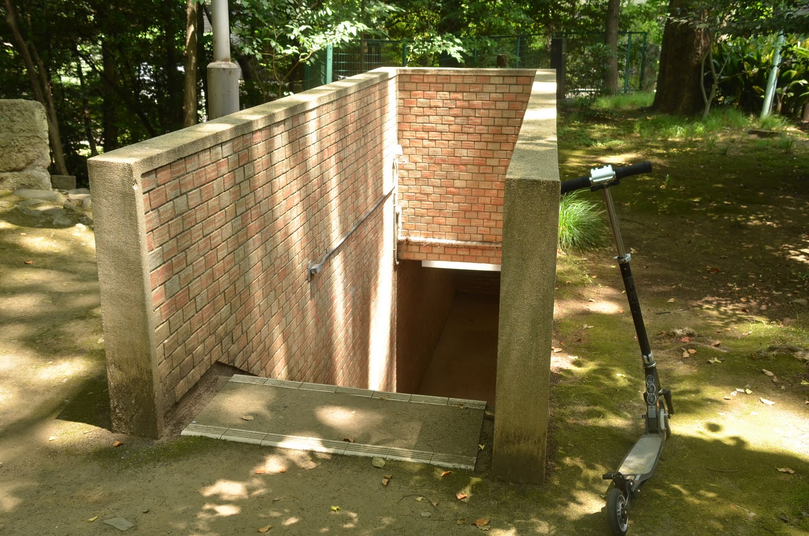 地下へ続く階段。右に見えるのが、わが愛車スパイダーマシンGP7フランス帰りトロチネット(キックボード) |