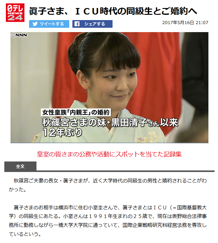 しかし小室圭さん、ICU卒ってことは恐らくカトリックなわけで、もしかして結婚式キリスト教式でやるの…?皇族が…?そうなると皇紀始まって以来の大事件では