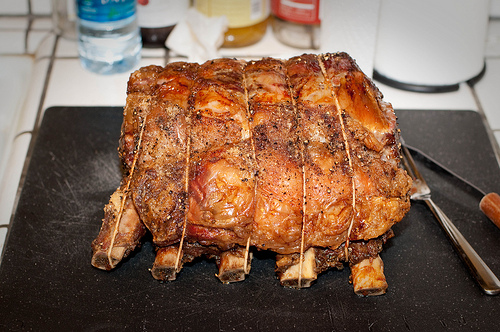 A bone-in rib roast.