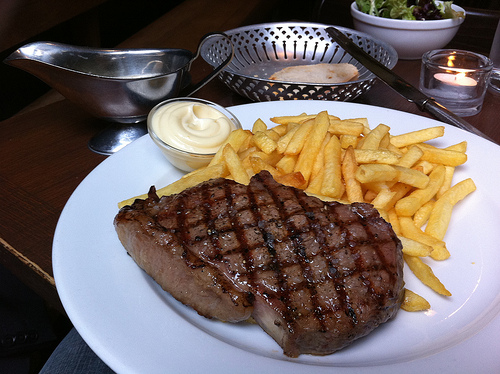 That’s steak and French fries in the USA and steak and chips in the UK.