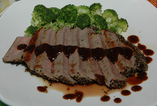 A steak cooked bien cuit in a wine based sauce.