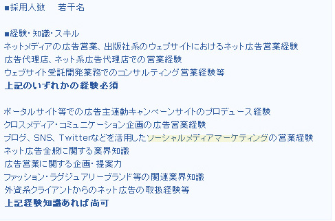 これはコンデナスト社の人材募集を彼のブログを通じて行った際の書き込みなのね。まあ彼が自分のブログを有料の求人媒体に匹敵するメディアであると認めている表れだけど、それはさておき、黄色くマーキングした部分の前後を見ていただきたい。「ブログSNS Twitterなどを活用したソーシャアルメディアマーケティングの営業経験」を求めていることがわかるよね。