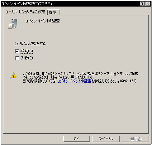 ローカル コンピューター ポリシー > コンピュータの構成 > Windows の設定 > セキュリティの設定 > ローカル ポリシー > 監査ポリシー - [ログオン イベントの監査]を開き、[成功]にチェックを入れて[OK]ボタンをクリックする。
