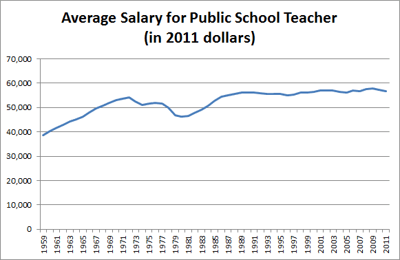 ReplyDeleteThe CATO number does not mention inflation adjusting, but the teacher salaries are in 2011 dollars. I don't believe those are comparable.