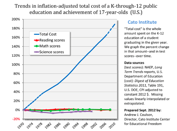 I agree with the premise, but I doubt our schools these days are teaching in a way thats any different than it was in the past. Whether its 1970 or 2016, a math teacher is still teaching math. With the extra 5k in costs, you would think that increase would show up in the test scores at least a little.