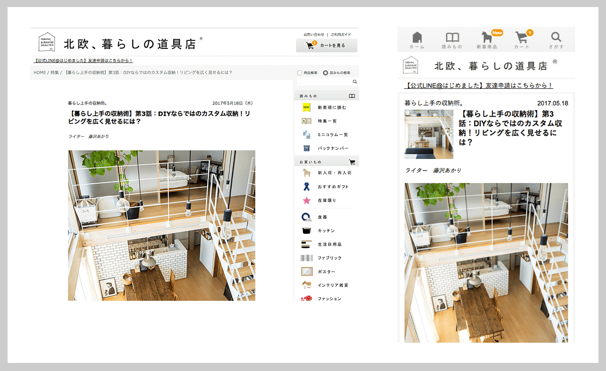 「北欧、暮らしの道具店」のWebメディアとしての部分で、WordPressでつくられています。買い物ページとデザインを統一し、シームレスに行き来できるようにしています。