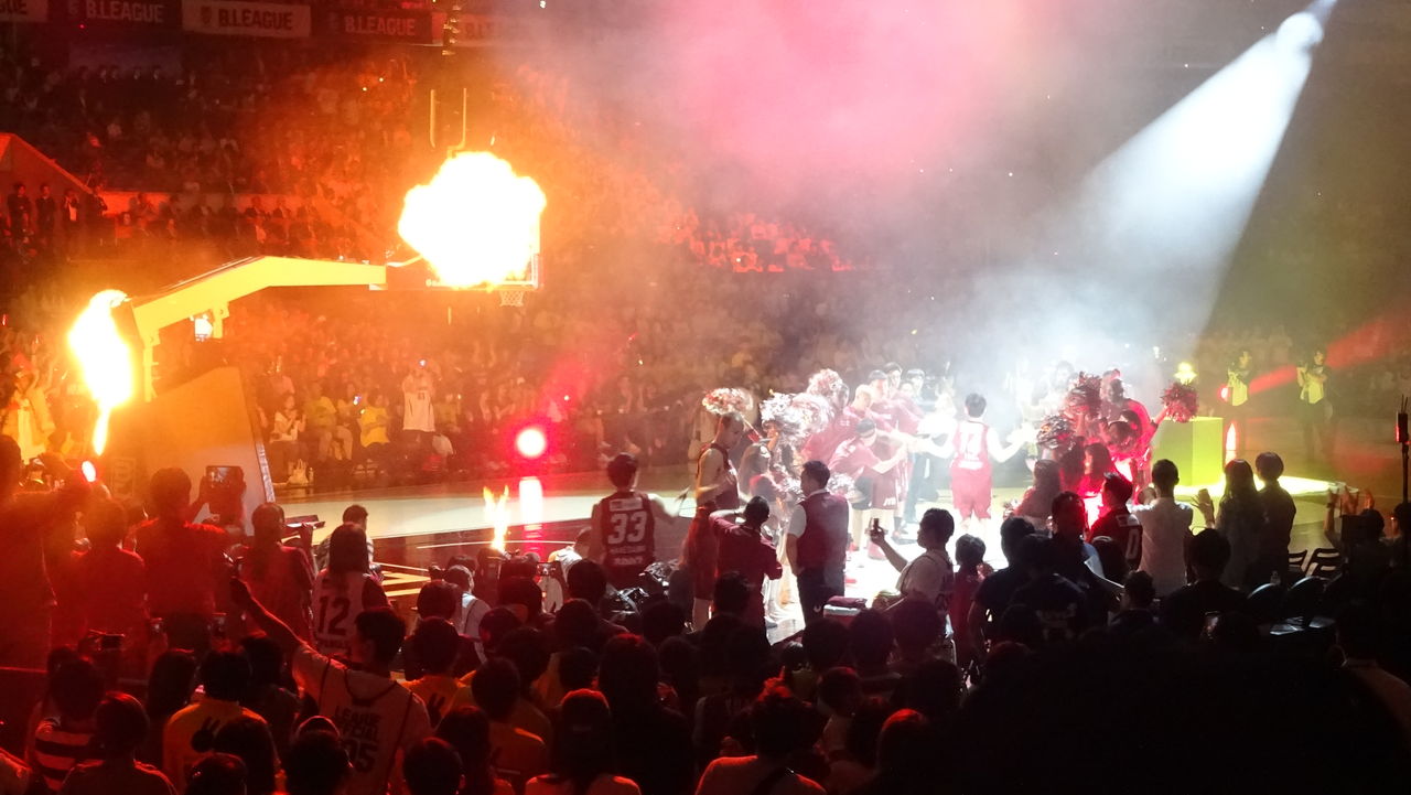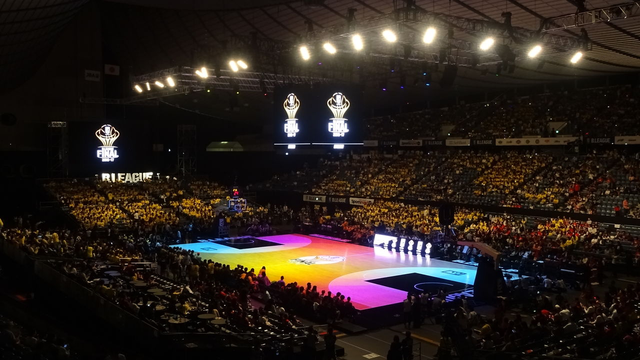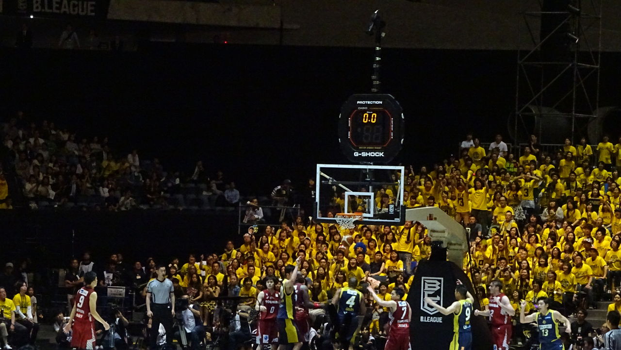 27日は今季の王者を決めるファイナルの日。チケットは完売で当日券もナシ。LEDビジョンコートの開幕戦にはまだ物珍しさもあり、高い高いダンクが飛び出したオールスターゲームには全国からの集客があった。しかし、このファイナルはまたひとつ進化した集まりになっていました。会場となる国立代々木第一体育館を埋め尽くしたのは、黄色と赤のブースター。もちろんデート客や親子連れといった中立組もたくさんいますが、ハッキリと色を持った集団がこの会場をビッシリと埋めていました。配られたシャツではなく、自分のシャツで。壮観でした。