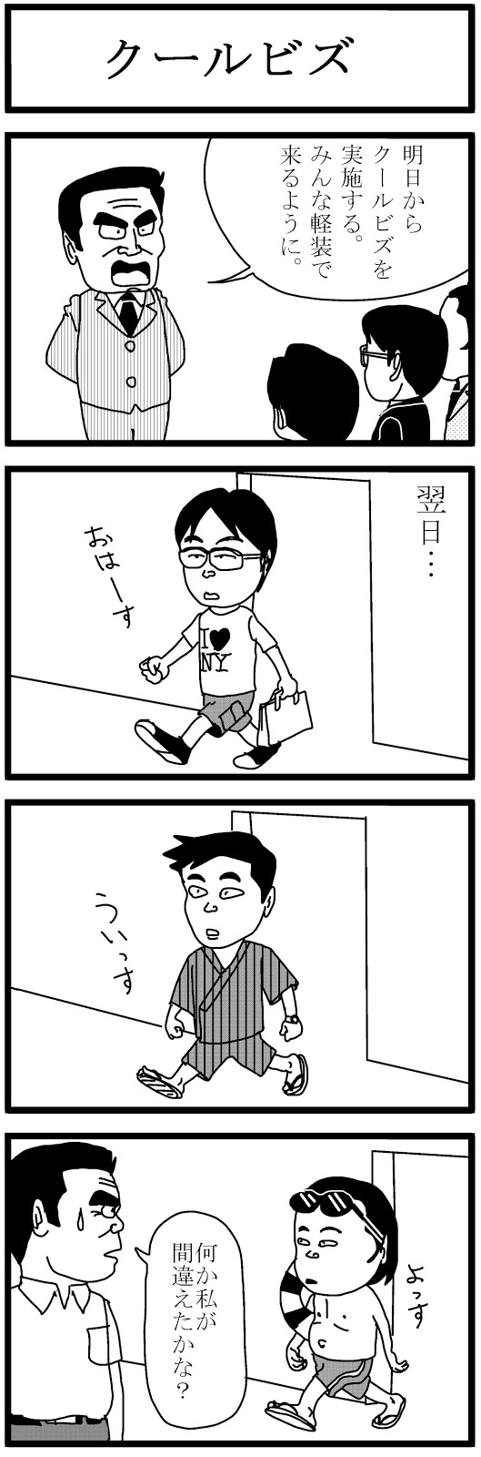 半袖Yシャツにノーネクタイなどという生ぬるいやり方では、クールビズの効果を発揮することは出来ない。暑いと効率が落ちると明確に言われているのだから、服装の完全自由化しか方法はないのである。
