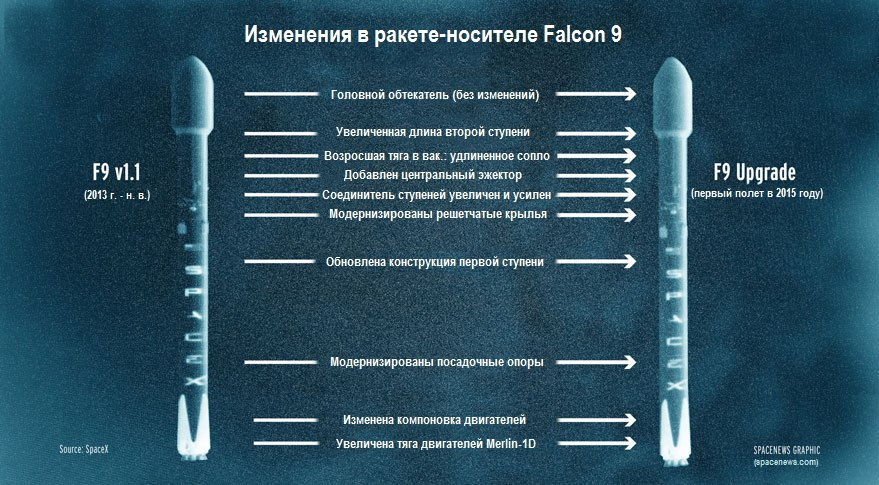 また合わせてこのエンジンを搭載するファルコン9にもいくつか改良が加えられファルコン9アップグレードなどと呼ばれています。非公式には「ファルコン9 v1.2」とも呼ばているのですが、現在使用されているファルコン9 v1.1のメインエンジンの配置が縦横3列(9基)から8面体状に中央の1つ(9基)に変更されており、第一弾と第二弾目の接続部分も強化れ全体的な高さはほとんど変わっていないものの、二段目の長さが異なっておりより多くの推進剤を搭載しています。