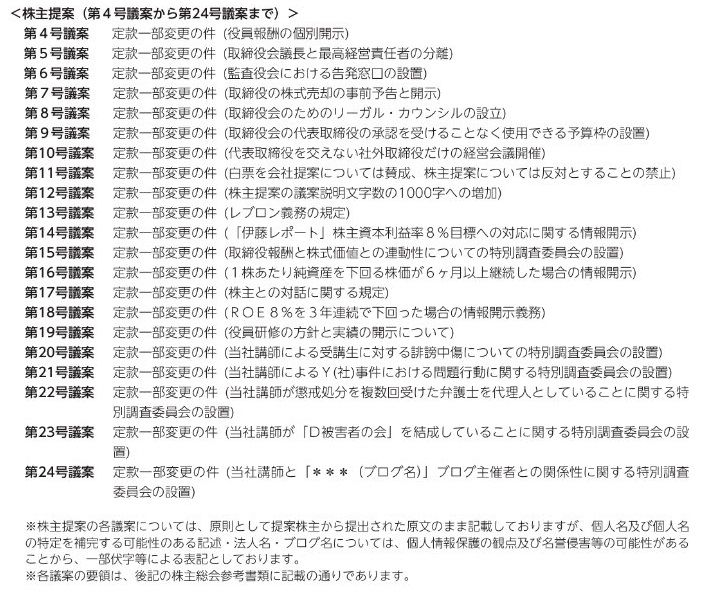 3名の株主から21本の株主提案。「個人名及び個人名の特定を補完する可能性のある記述・法人名・ブログ名・URLについては」伏せ字。