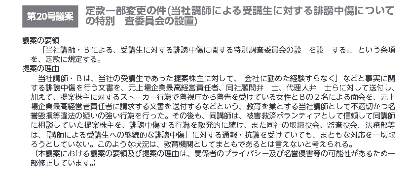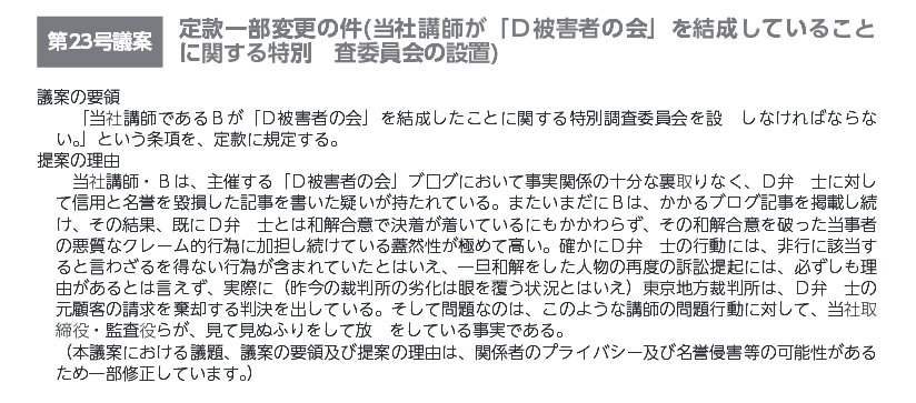 ・定款一部変更の件(当社講師が「D被害者の会」を結成していることに関する特別調査委員会の設置)