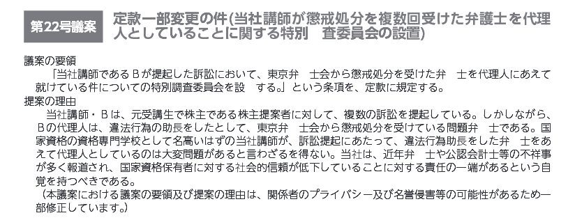・定款一部変更の件(当社講師が懲戒処分を複数回受けた弁護士を代理人としていることに関する特別調査委員会の設置)