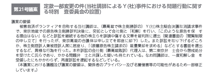 ・定款一部変更の件(当社講師によるY(社) 事件における問題行動に関する特別調査委員会の設置)