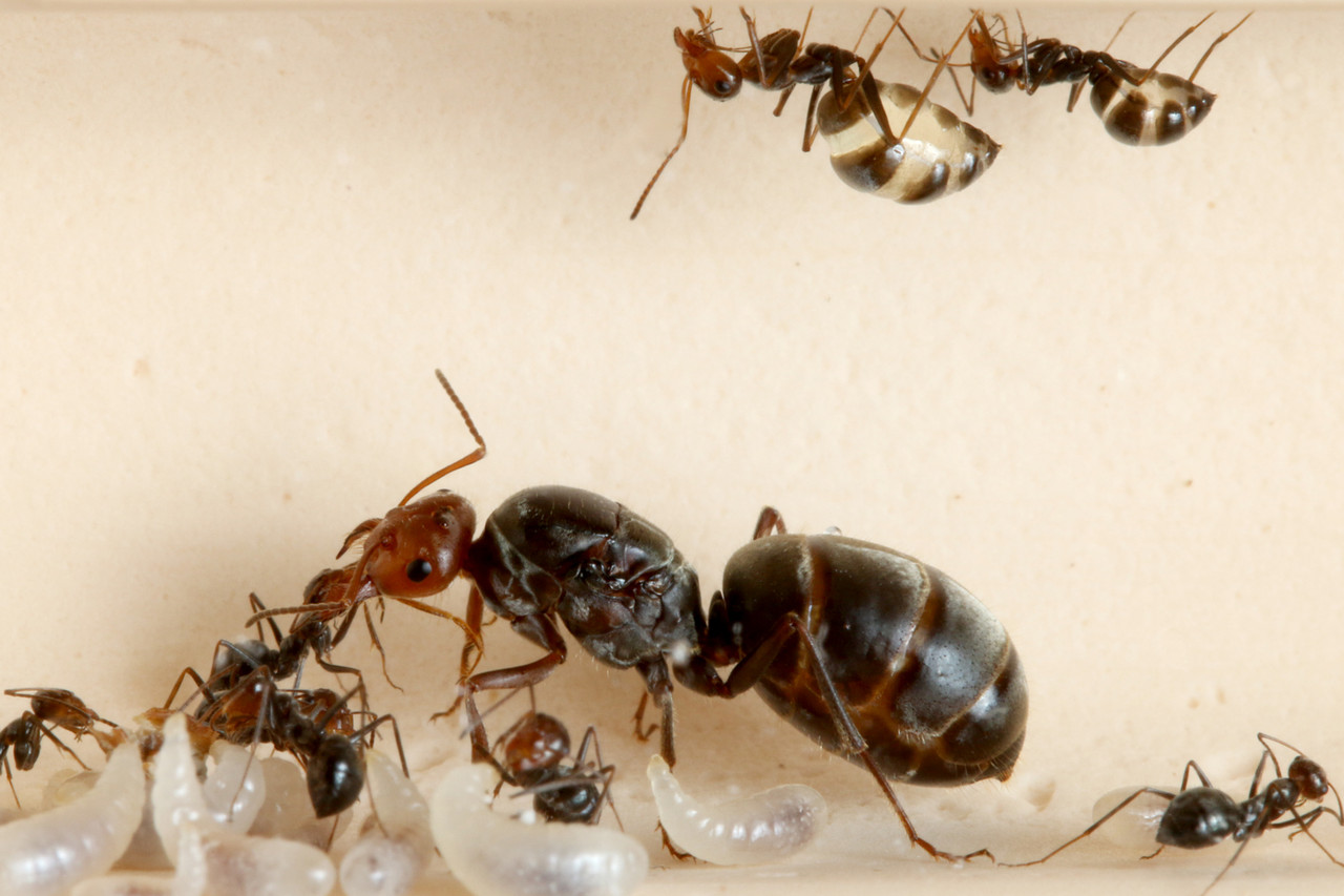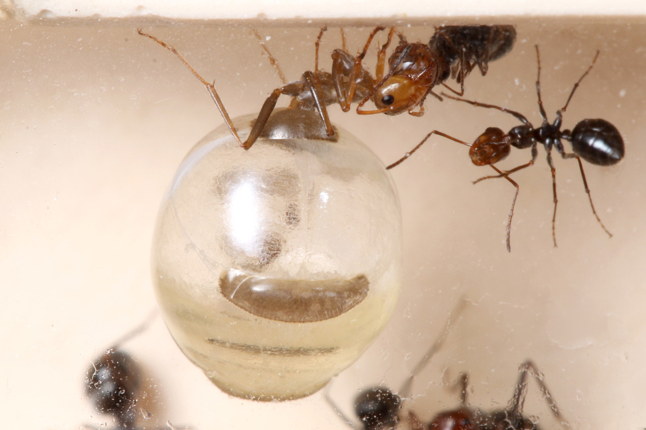 蜜壺役となる個体は、生まれつき特別な個体と言うわけではなく、働きアリの数がある程度増えてくると、一部の羽化したばかりの個体に一気に大量のエサを与えて腹部を伸ばしていたのです。