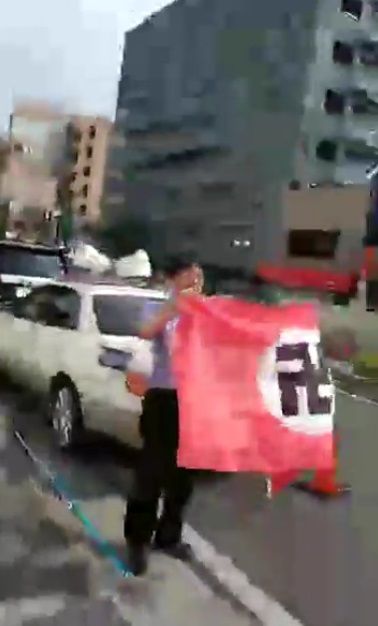 画像:ハーケンクロイツの旗を掲げる高木脩平・護国志士の会局長