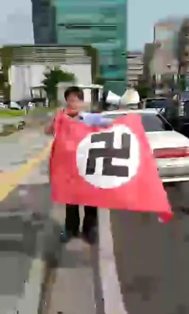 そのため、11日当日の街宣には当時デモで用いたナチス・ドイツの旗ハーケンクロイツを持参したものである。