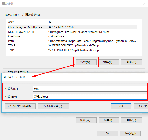 表示されたダイアログに、前述の環境変数の情報([変数名]:「exp」、[変数値]:「C:\Explorer」)を入力して[OK]ボタンをクリック