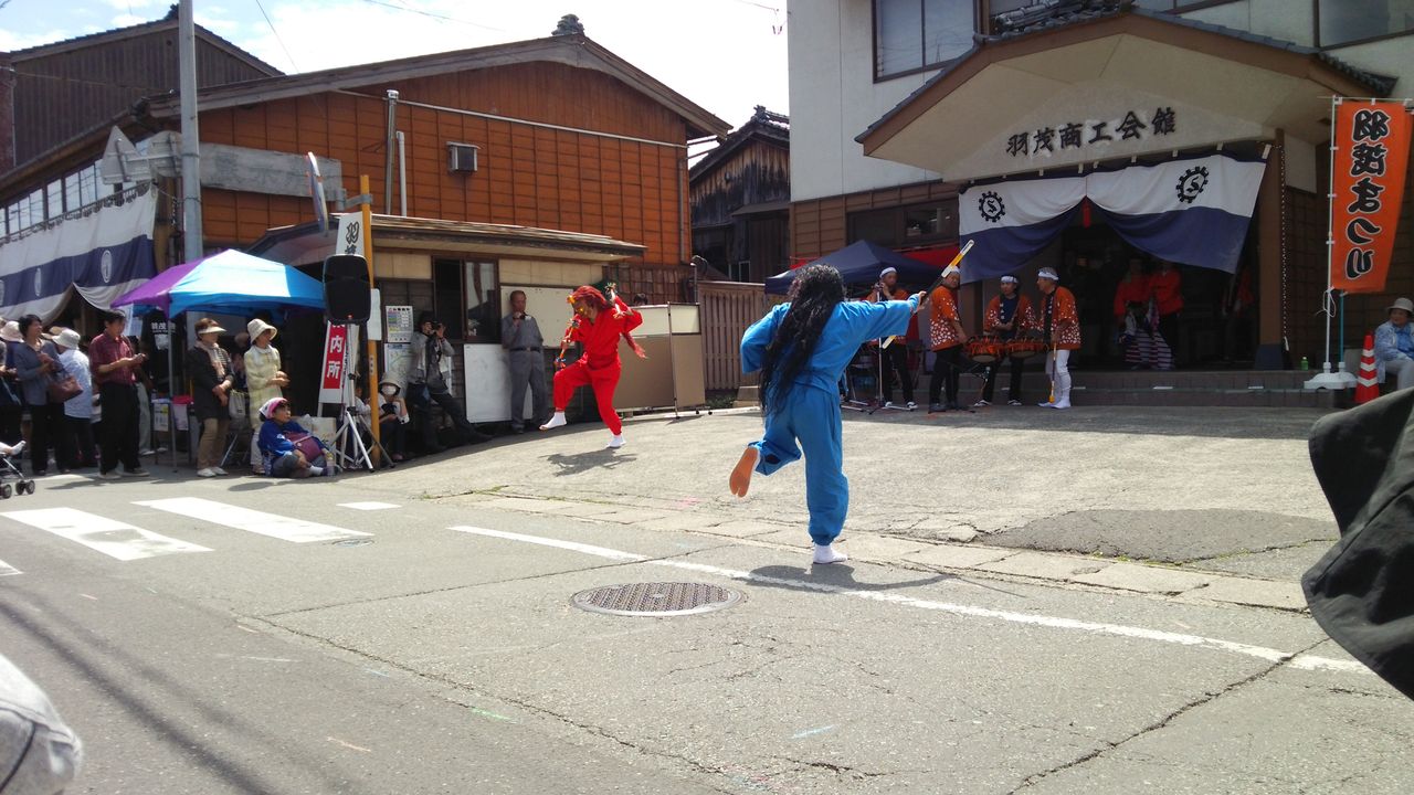 大獅子舞は菅原神社・草刈神社ともに8時から行っているのだがまったく遭遇できないのである!警備員の人や実行委員の人に聞いてみるものの、一足遅く、既に去ってしまった後だった。いたるところで「カツンカツン」という音がしているのだが悲しい。結局商工会前広場で待っていたら大獅子舞はやってきた。その一場面である。