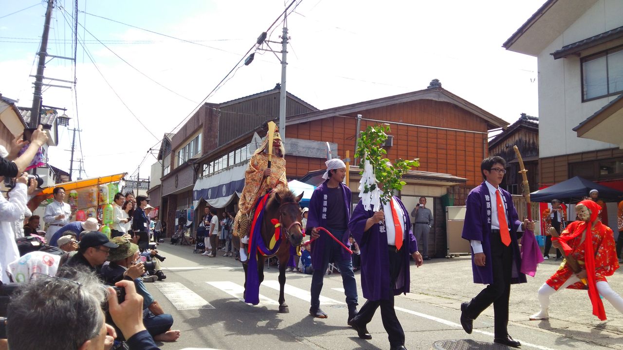 こちらは商工会前で「つぶろさし」を見ていたところ、スタッフの人から「今から神様通るので道を開けて下さい!」との声で道が割れたところを馬に乗り過ぎ去る場面だ。御輿渡御の際に先導する猿田彦神は結構あるみたいだが、猿田彦神単独では結構珍しいのではないだろうか。