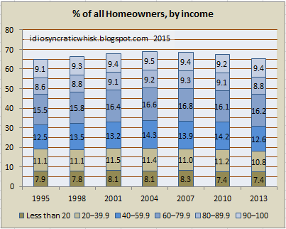 There is a common belief that the so-called housing bubble was a predation of Wall Street on the poor. This is wrong. There is predation on the poor by planning commissions and housing obstructionists. During the so-called bubble, Wall Street was mostly funding mortgages to the top 40% of households, by income. The bottom 40% are divided between older homeowners who have little or no mortgage debt and renters. The bottom 40% were largely untouched by the first-order effects of the bubble and bust. For the older, unleveraged homeowners, some experienced a brief gain in equity that was subsequently reversed, with little effect on their year-to-year finances. For the renters, the housing bubble meant that they may have briefly had a reprieve from relentless rent increases. This may have required a move away from the coastal cities. But, it was available. The bust has turned the screws even tighter.